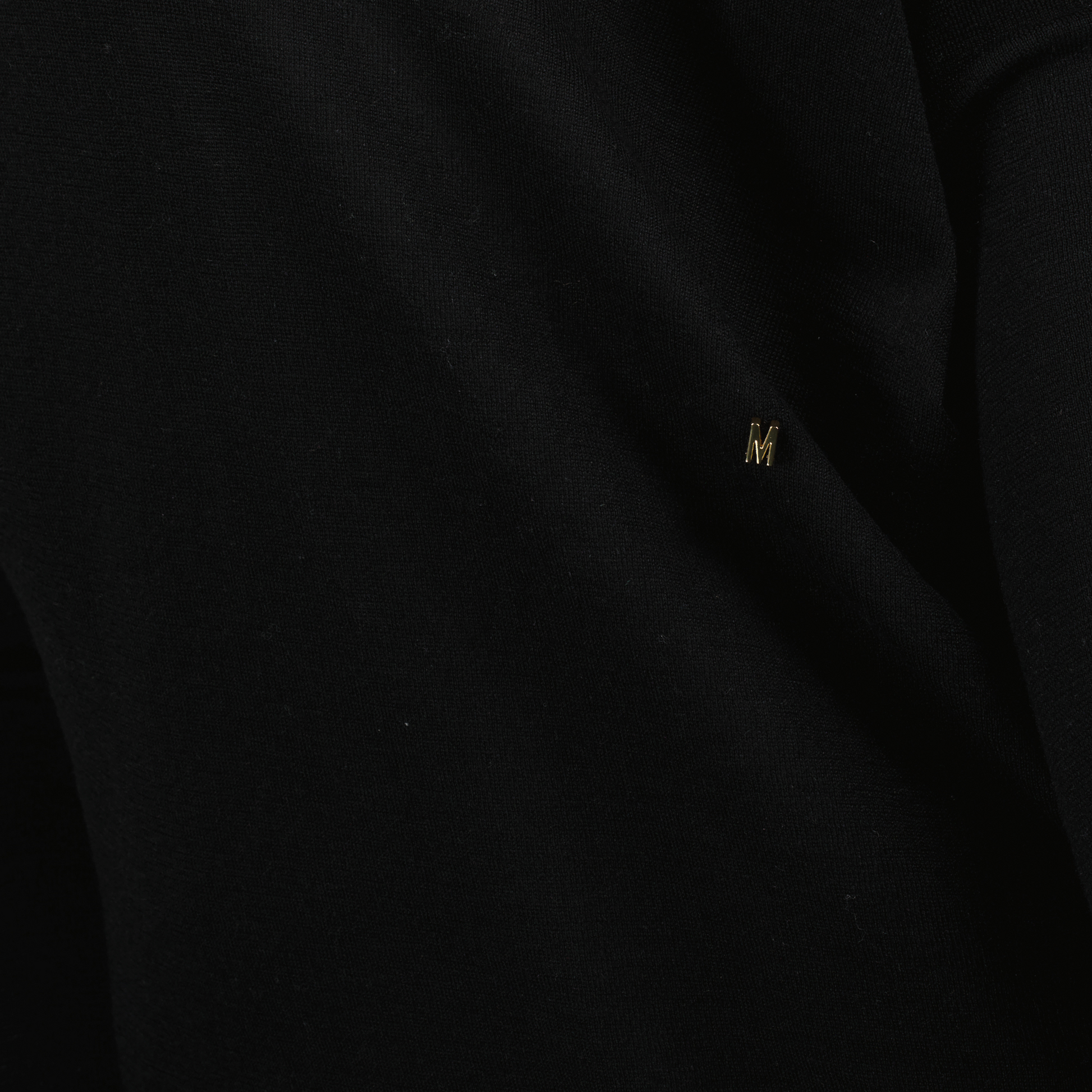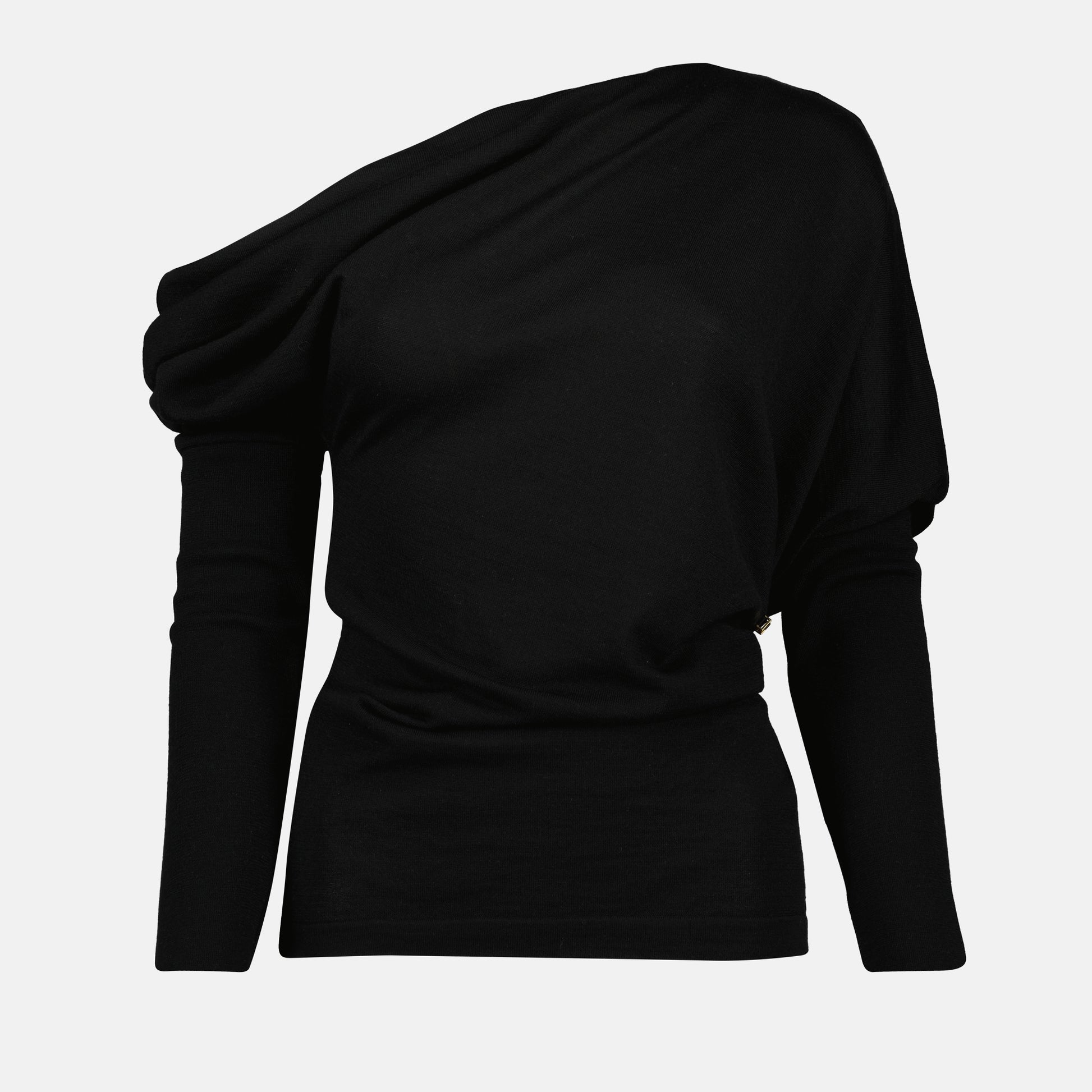 Pull en laine à col drapé noir de Moschino pour femme. Cette pièce fait partie de la collection Printemps-Été 2025 et se distingue par sa coupe drapée et son logo métallique.