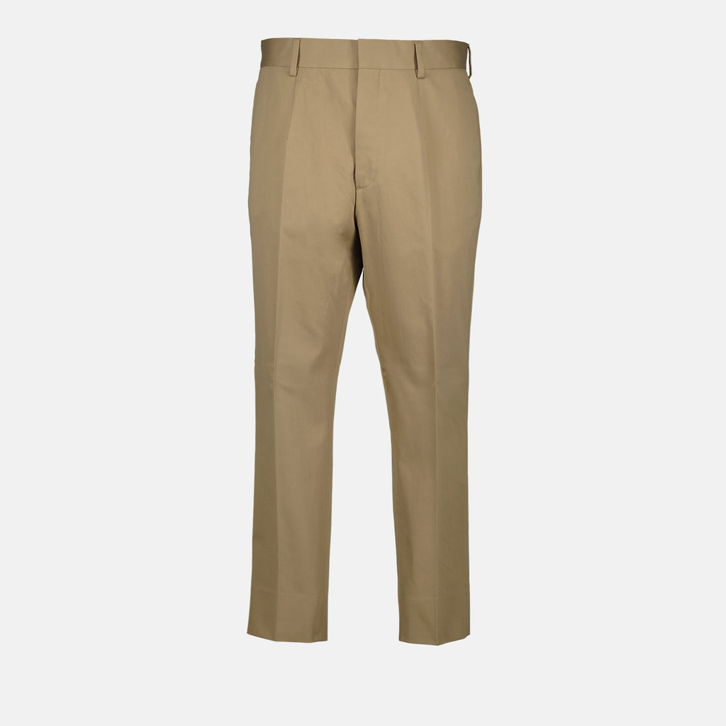 Le pantalon chino beige Prada pour homme est conçu en coton avec une coupe droite. Il est doté d'une fermeture agrafe et zip, ainsi que du logo triangle emblématique de la marque. Les poches latérales fendues et les poches arrière ajoutent à la fonctionnalité de ce vêtement. Réalisé en coton de haute qualité, il est également pourvu de passants pour ceinture. Ce pantalon chino est à la fois élégant et confortable, parfait pour une tenue décontractée mais soignée. Que ce soit pour une journée de travail ou une sortie entre amis, ce pantalon Prada apportera une touche de style à votre garde-robe.