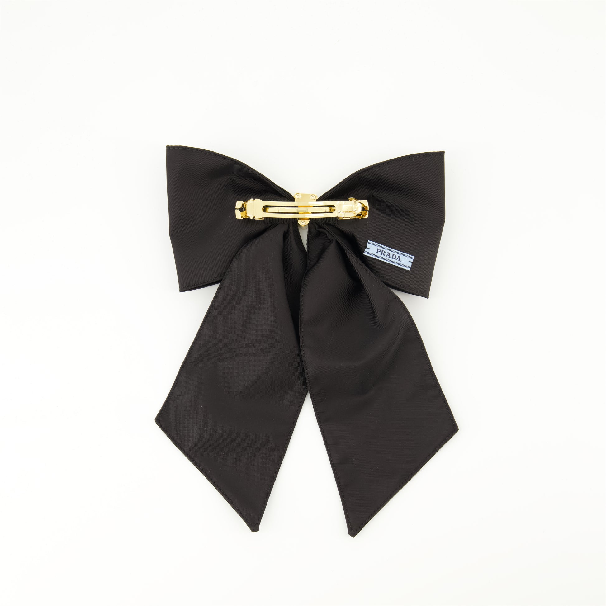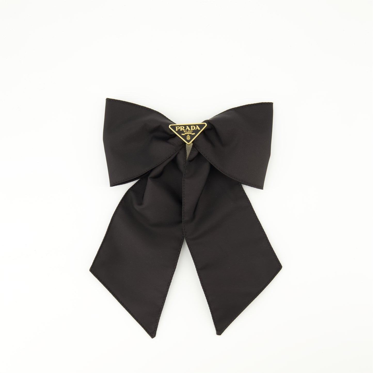 Barrette à noeud en Re-nylon de Prada, conçue pour les femmes, fait partie de la collection Printemps-Été 2025. Elle est réalisée en nylon recyclé et présente un logo triangle en métal émaillé.