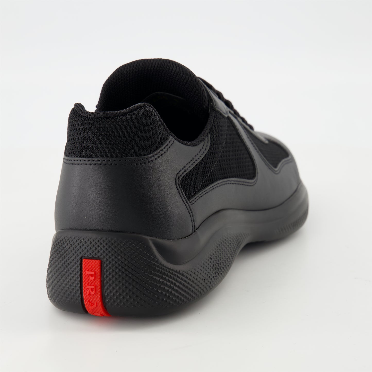 Baskets en cuir noir America's Cup de Prada, pour homme, allient élégance et confort. Cette paire fait partie de la collection Printemps-Été 2025 avec des détails raffinés et modernes.