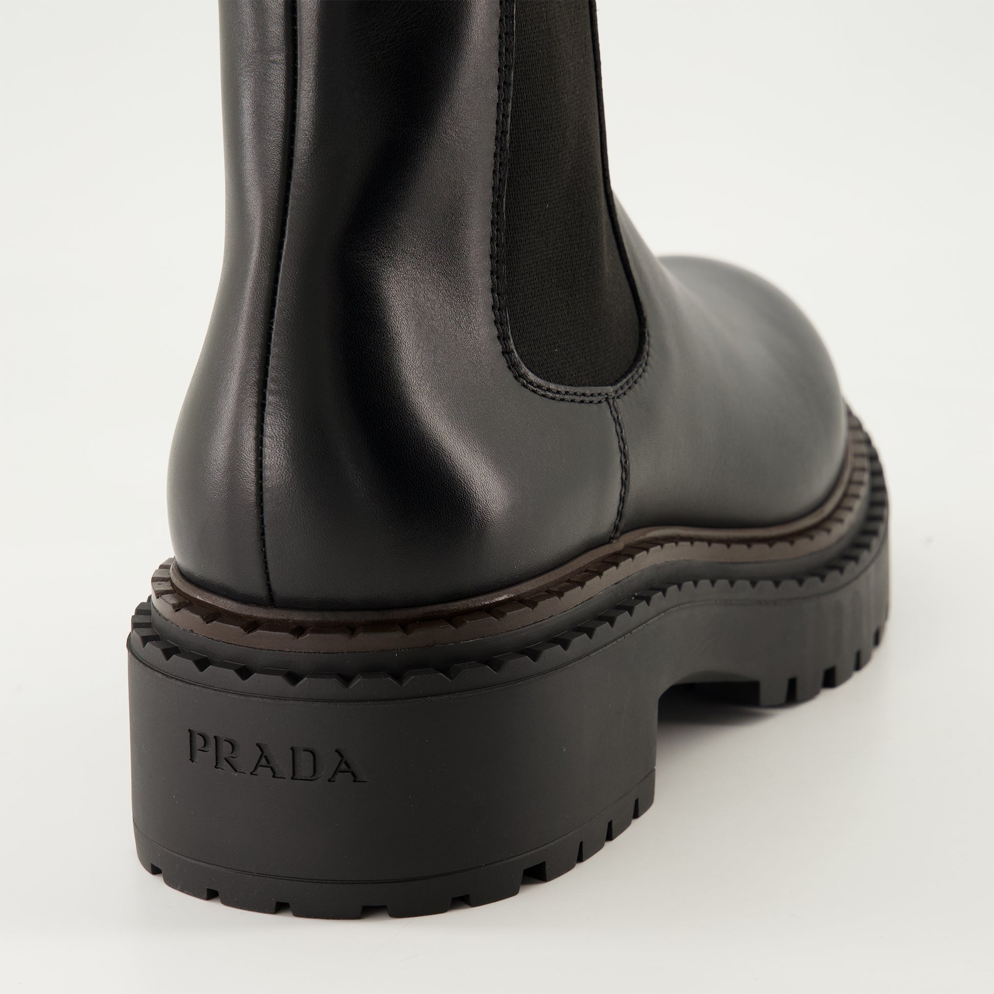 Bottines en cuir noir Prada pour homme de la collection Automne-Hiver 2024. Ce modèle à enfiler présente un bout en amande et une semelle crantée en gomme.