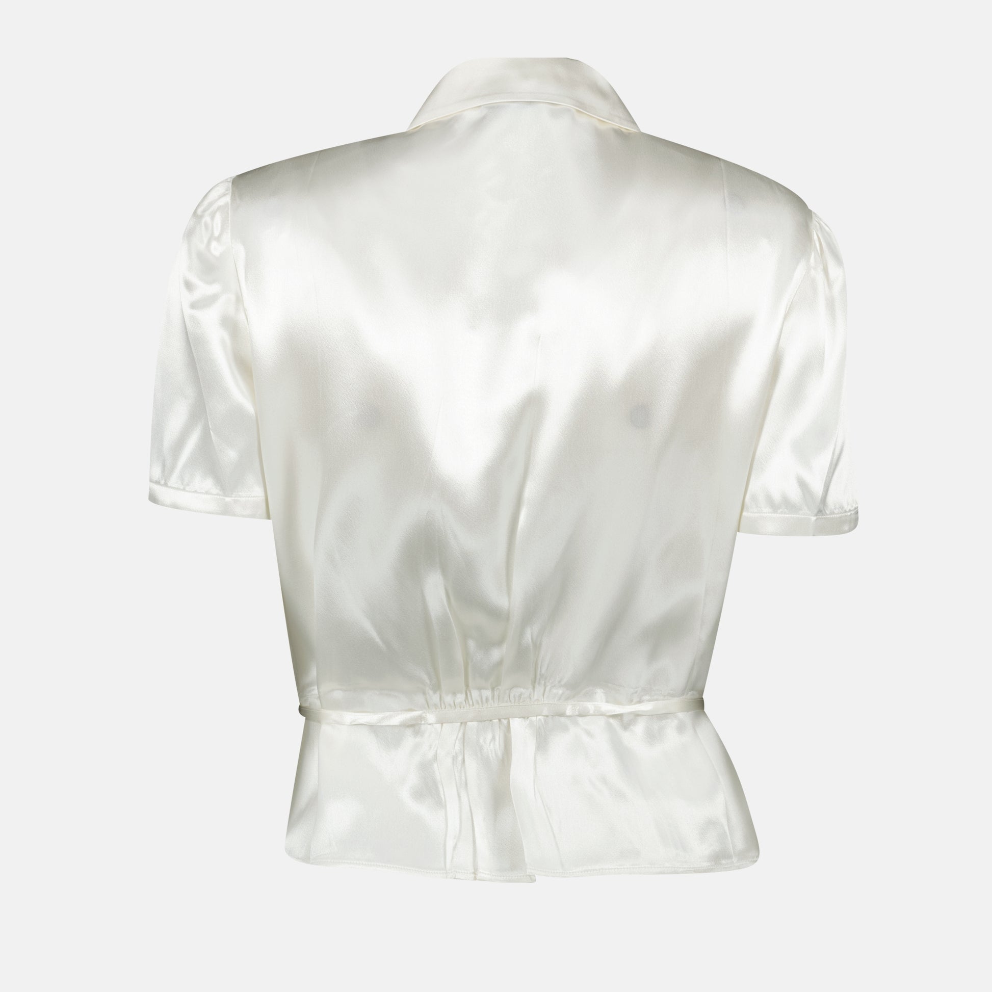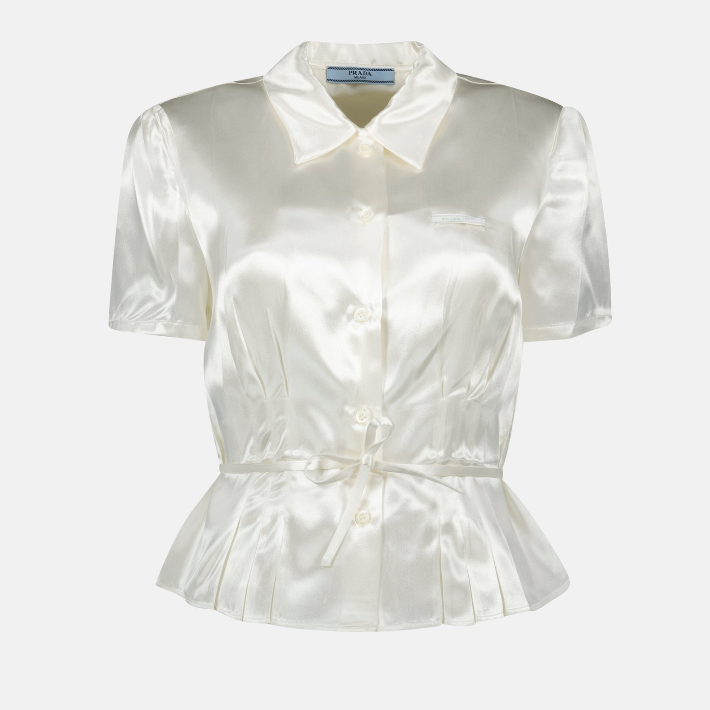 Chemise en satin blanc de Prada pour femme. Cette pièce fait partie de la collection Printemps-Été 2025 et présente une coupe cintrée avec col classique et manches courtes.