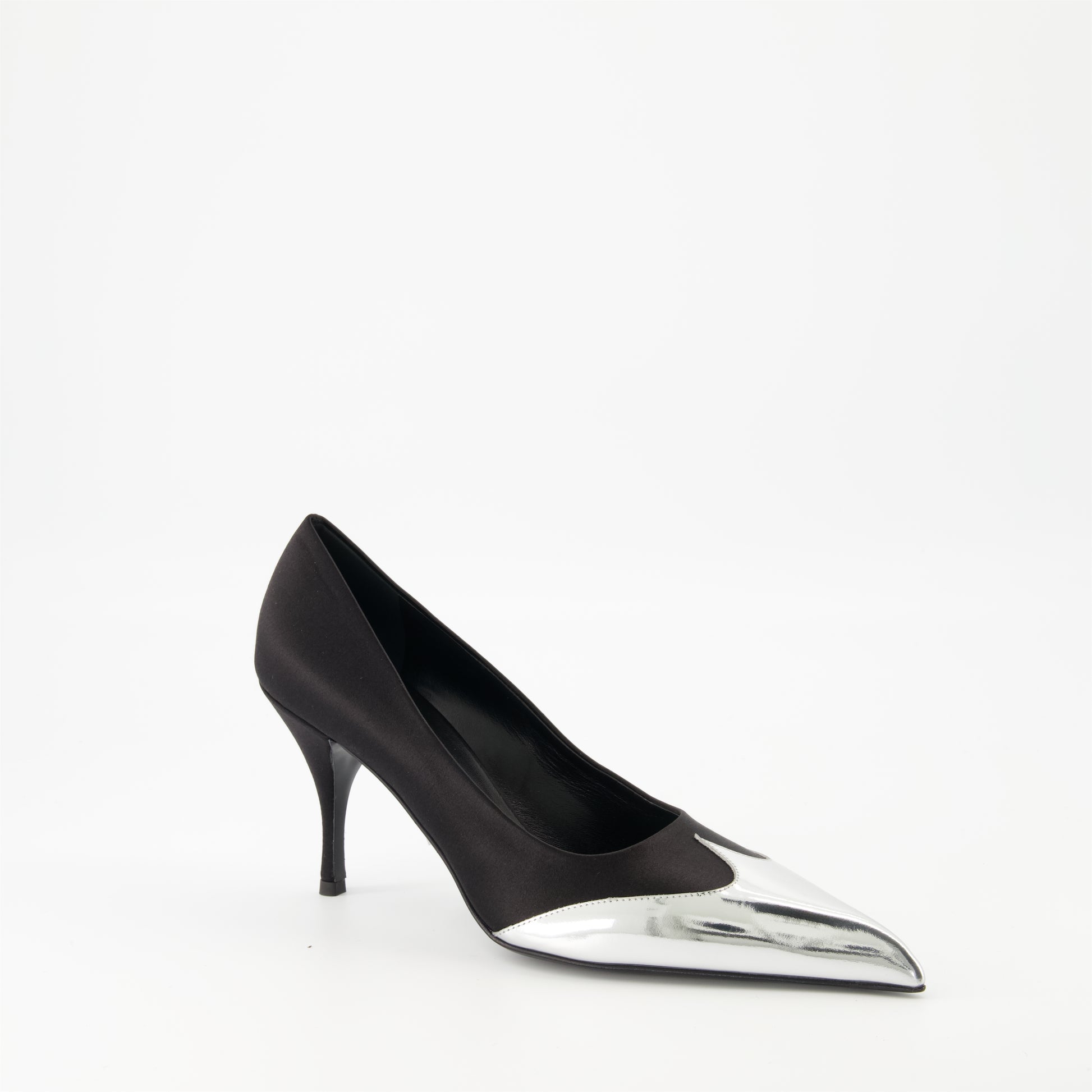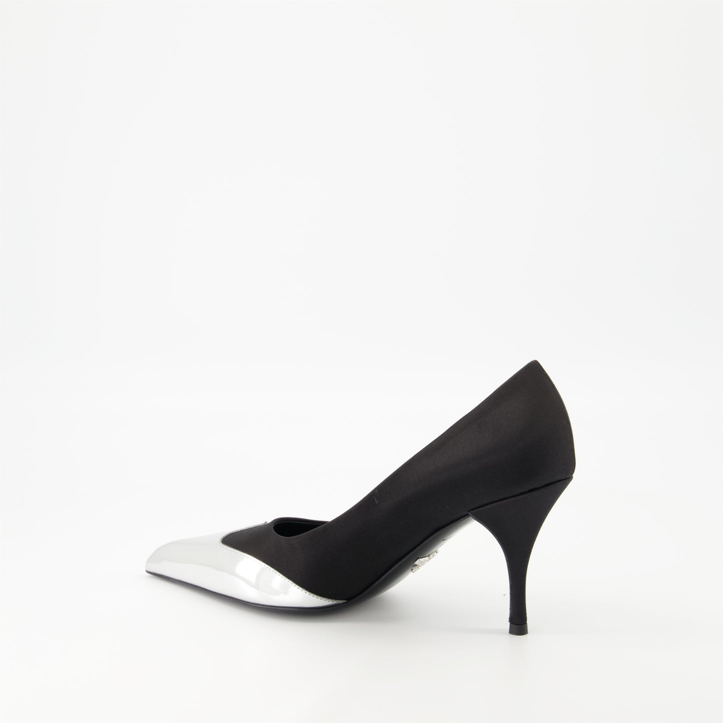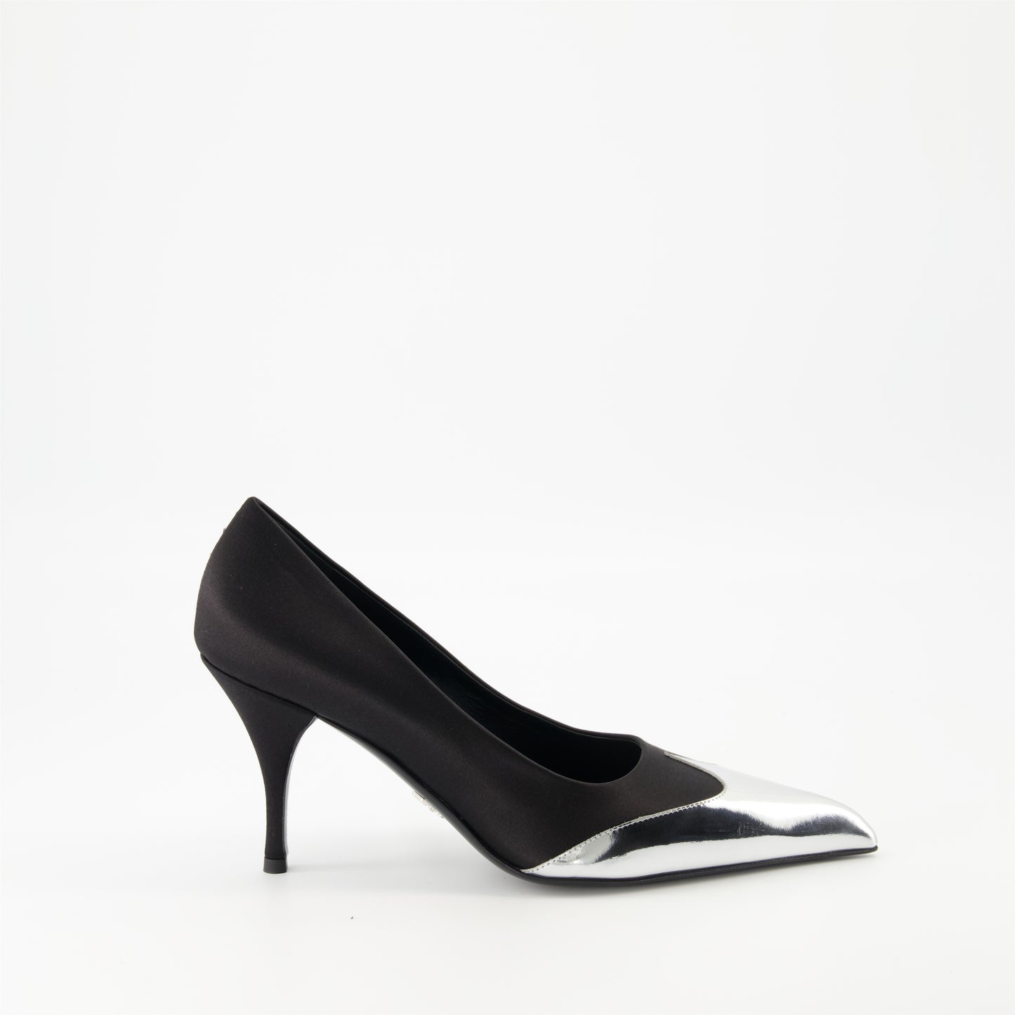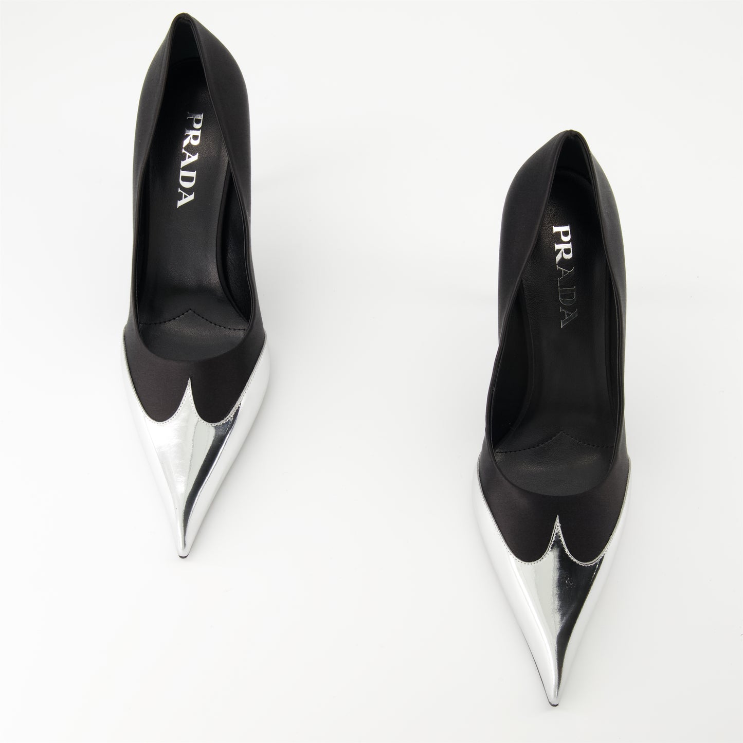 Escarpins en satin et cuir noir de Prada pour femme, collection Printemps-Été 2025. Ils présentent un bout pointu, un talon recouvert de satin et des détails en cuir métallisé.