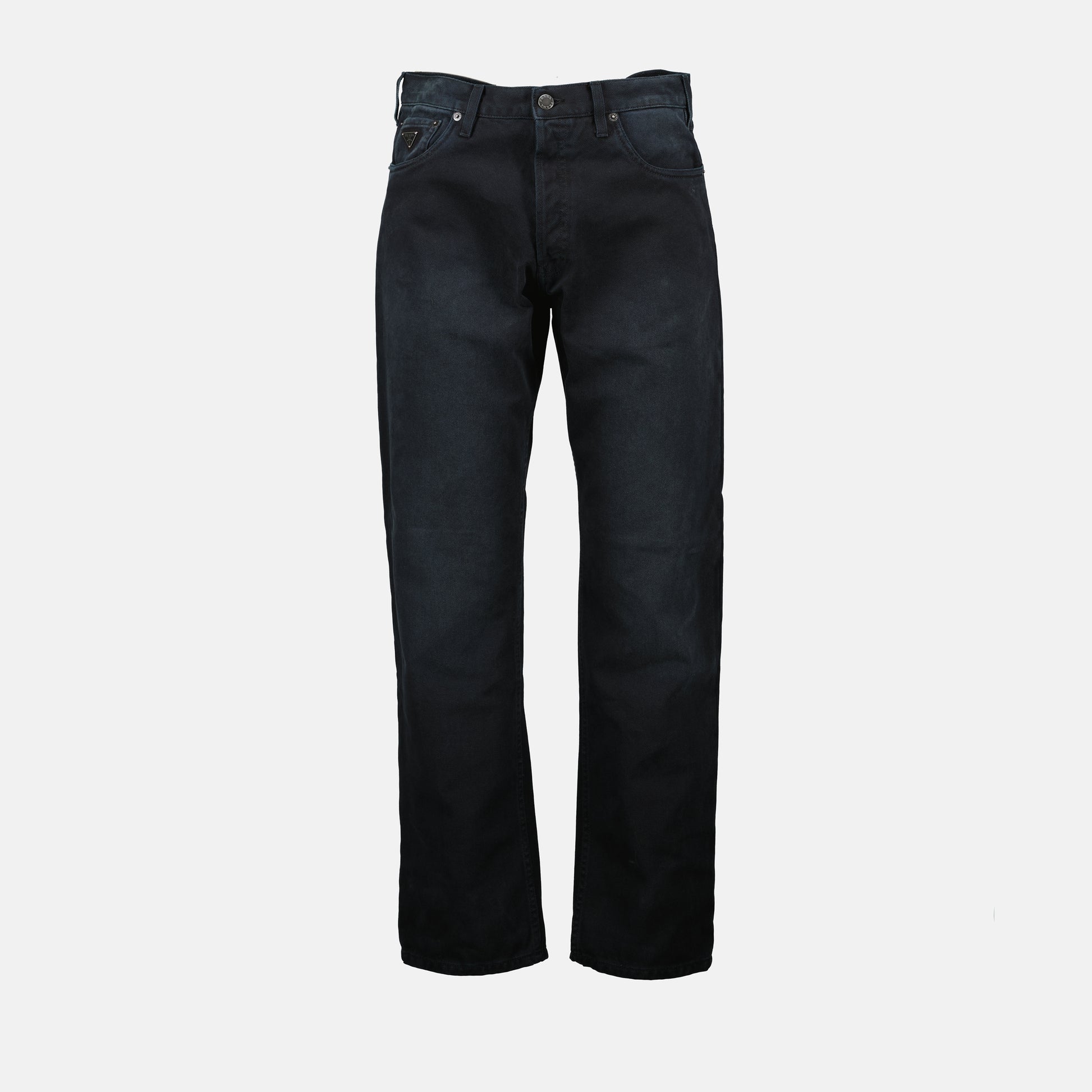 Jean droit noir délavé de Prada pour homme, issu de la collection Printemps-Été 2025. Réalisé en coton avec un design à cinq poches et une taille classique.
