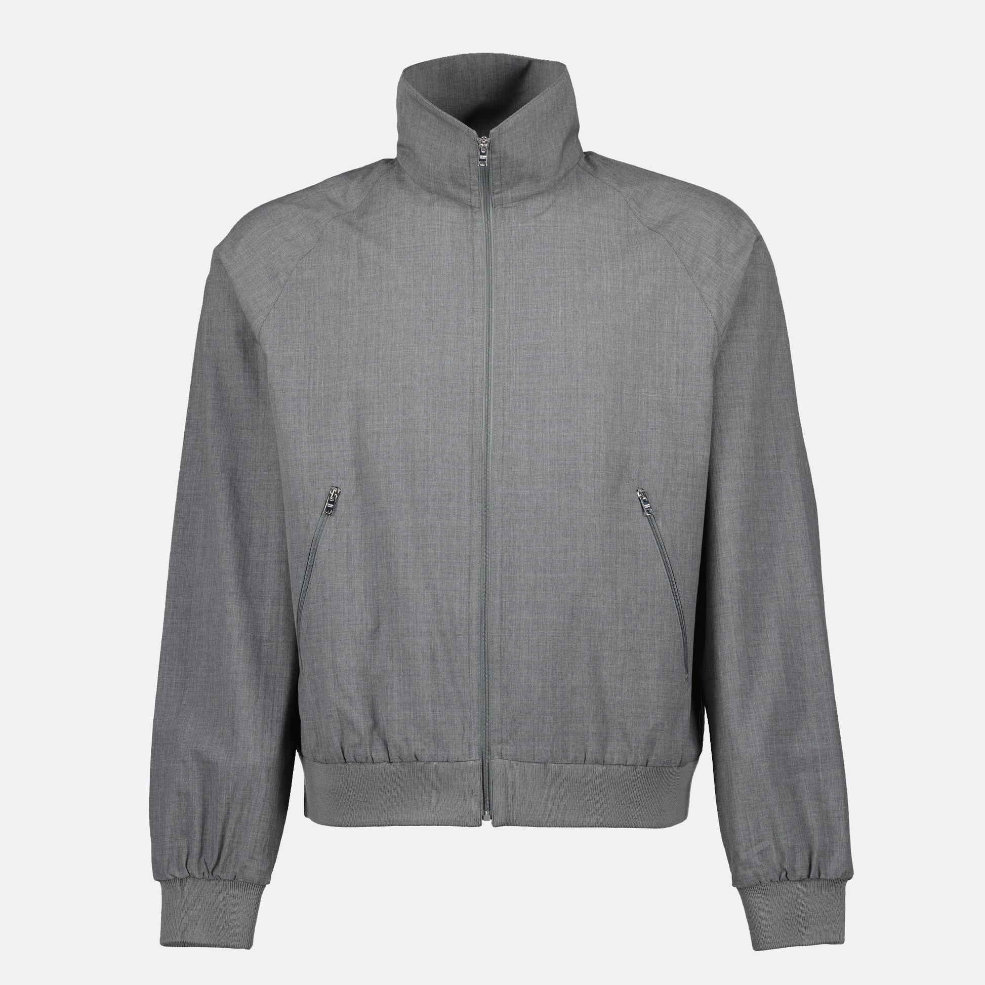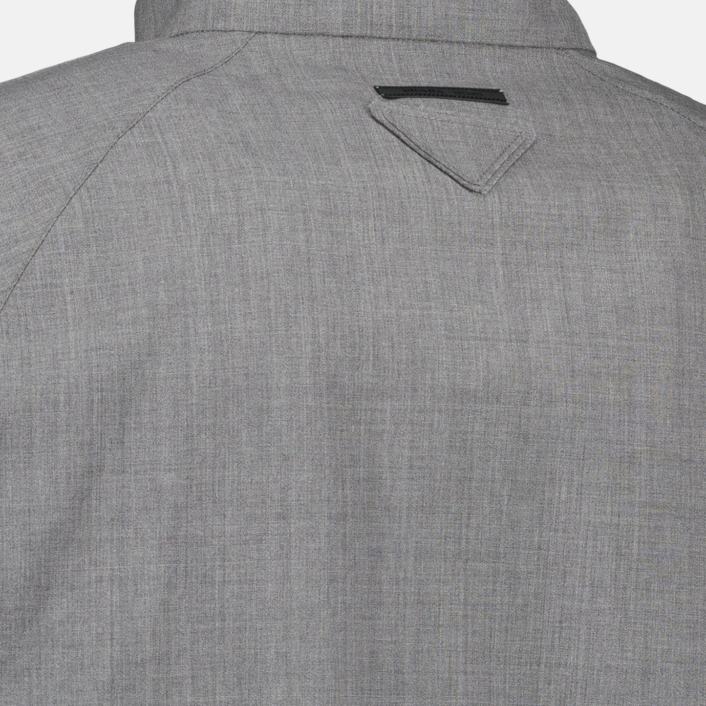 Veste en laine grise de Prada pour homme, issue de la collection Automne-Hiver 2025. Elle présente un col montant, des manches longues et une fermeture zippée sur le devant.