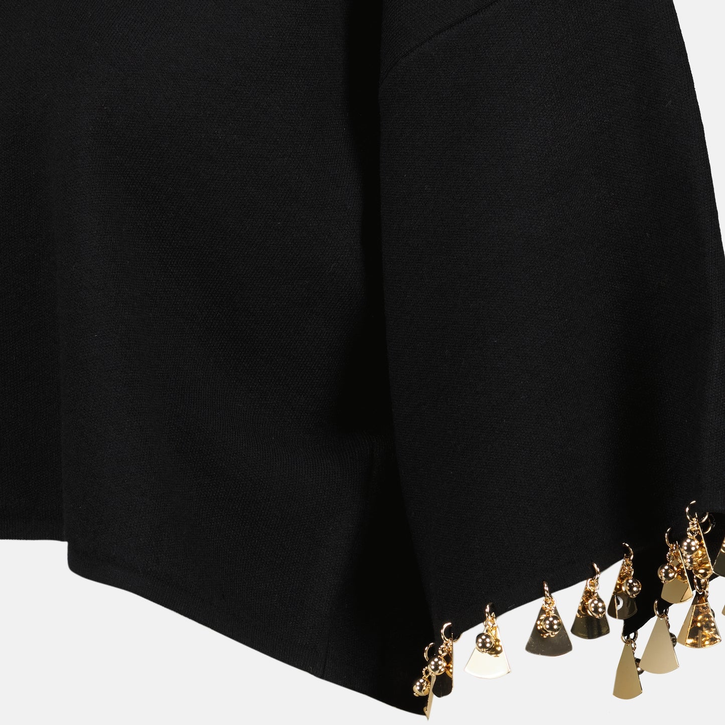 Pull court en maille noir de la marque Rabanne pour femme. Faisant partie de la collection Printemps-Été 2025, il présente un col rond et des détails en métal doré.