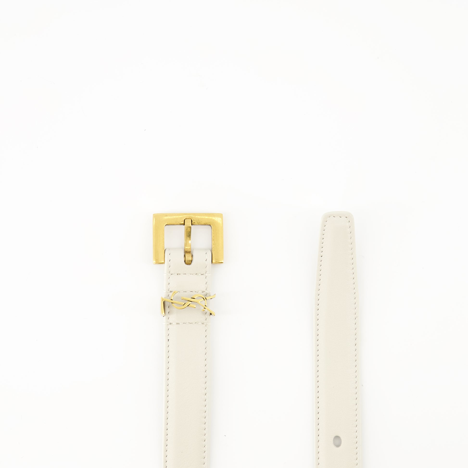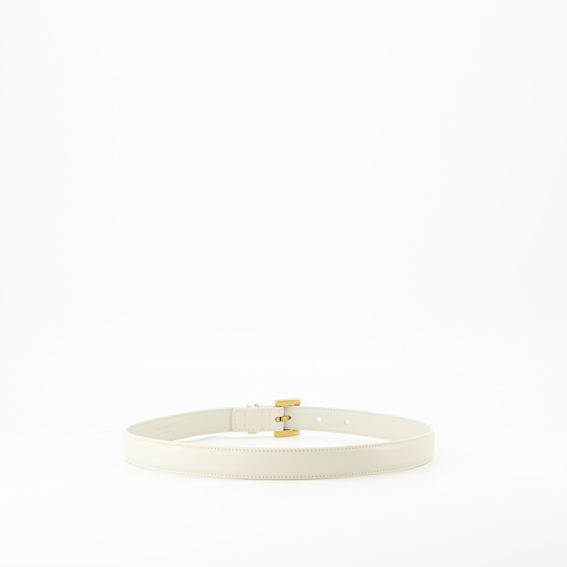 La ceinture fine Cassandre blanche de Saint Laurent est un accessoire élégant pour femme. Faisant partie de la collection Printemps-Été 2025, elle allie cuir de veau et détails en métal.