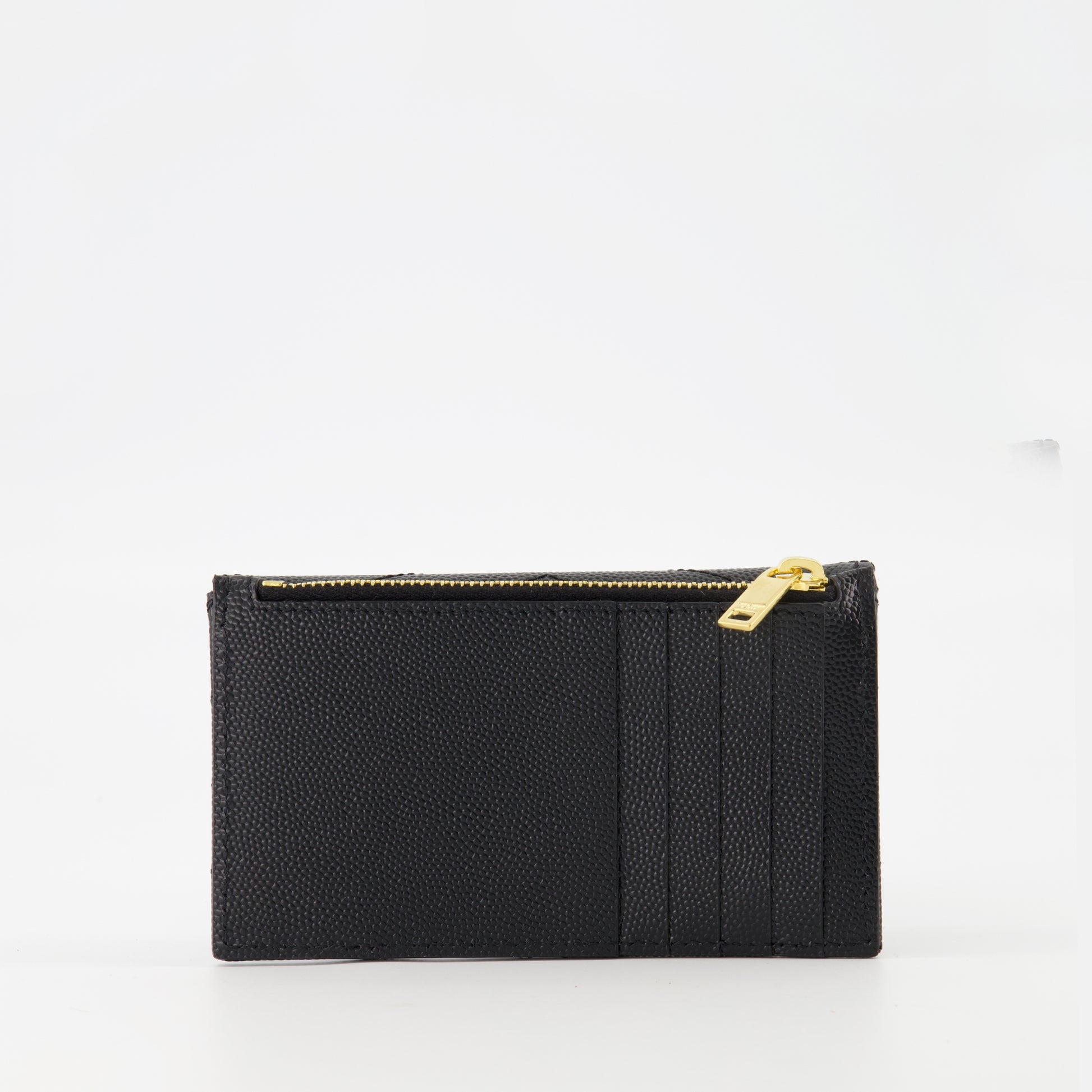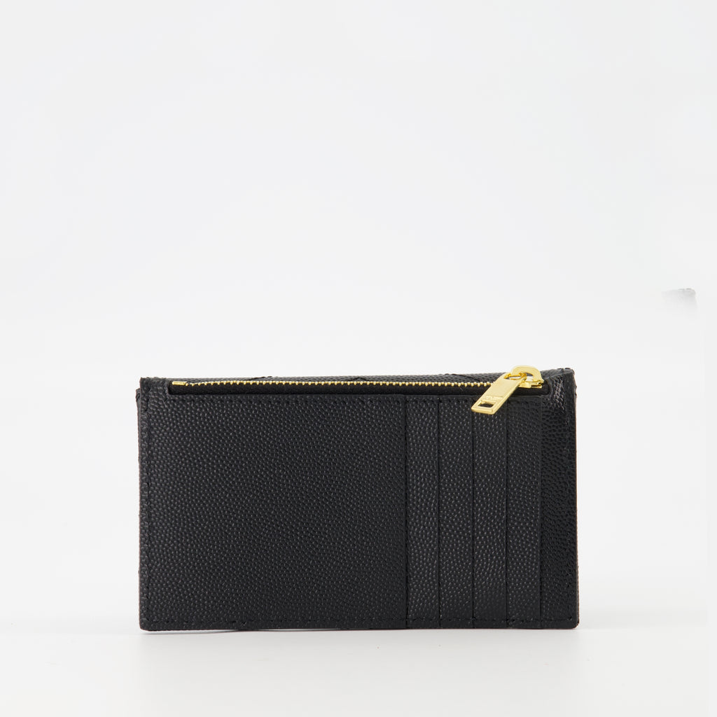 Le porte-cartes Cassandre Fragments noir de Saint Laurent incarne l'élégance moderne et la fonctionnalité. Confectionné en cuir de veau grainé de haute qualité, il se distingue par son design raffiné et sa finition soignée. Le rabat à bouton pression assure une sécurité optimale, tandis que le logo lettering métallique Cassandre ajoute une touche de luxe. Avec cinq fentes pour cartes, une poche plate, une poche zippée pour la monnaie et une poche pour les billets, ce porte-cartes est idéal pour une utilisation quotidienne. Sa couleur noire classique s'adapte à toutes les tenues, faisant de cet accessoire un incontournable pour la femme contemporaine. Disponible également en plusieurs couleurs, il permet à chacune de personnaliser son style. La bijouterie en laiton doré apporte une note sophistiquée, faisant de ce porte-cartes un choix parfait pour la collection Printemps-Été 2025 de Saint Laurent.