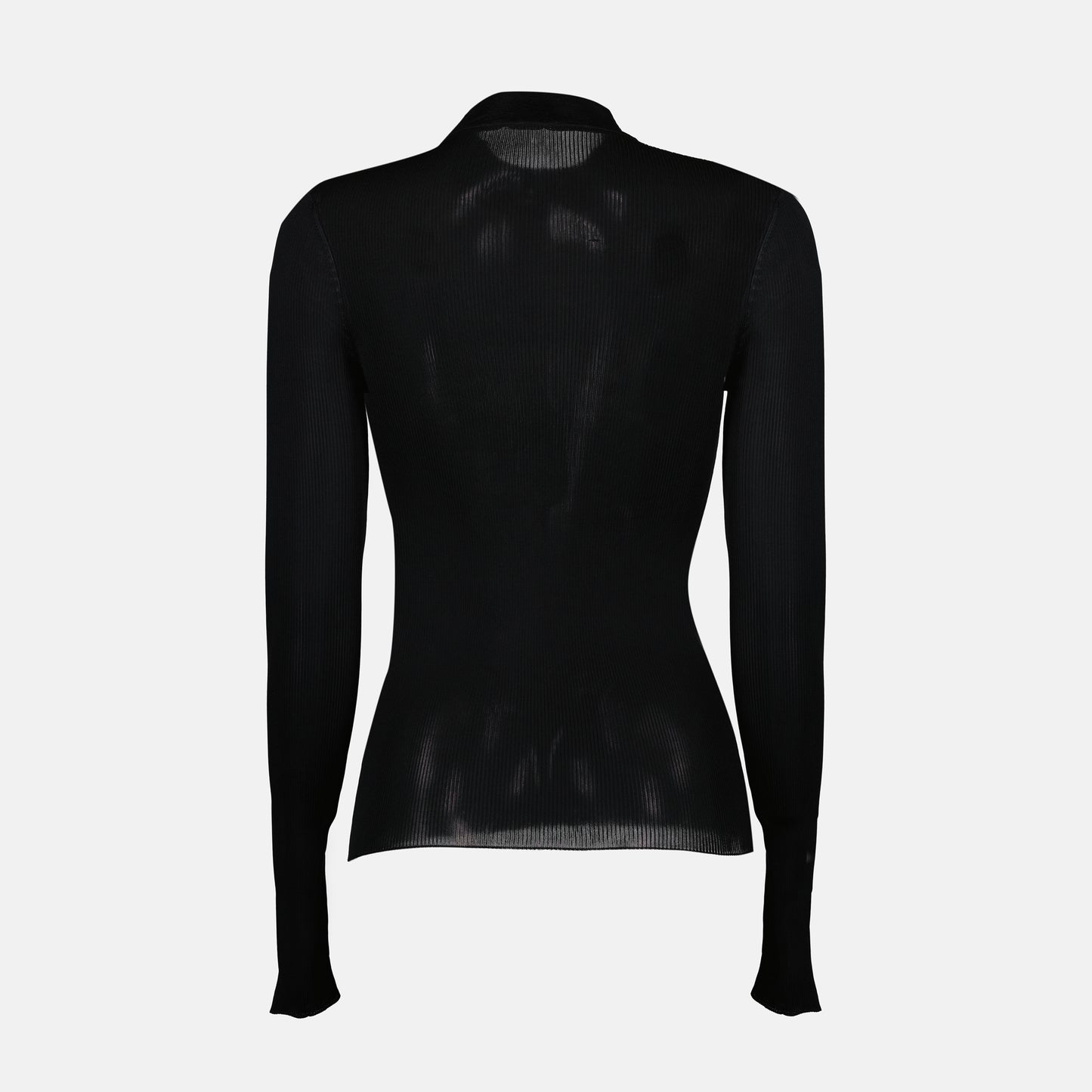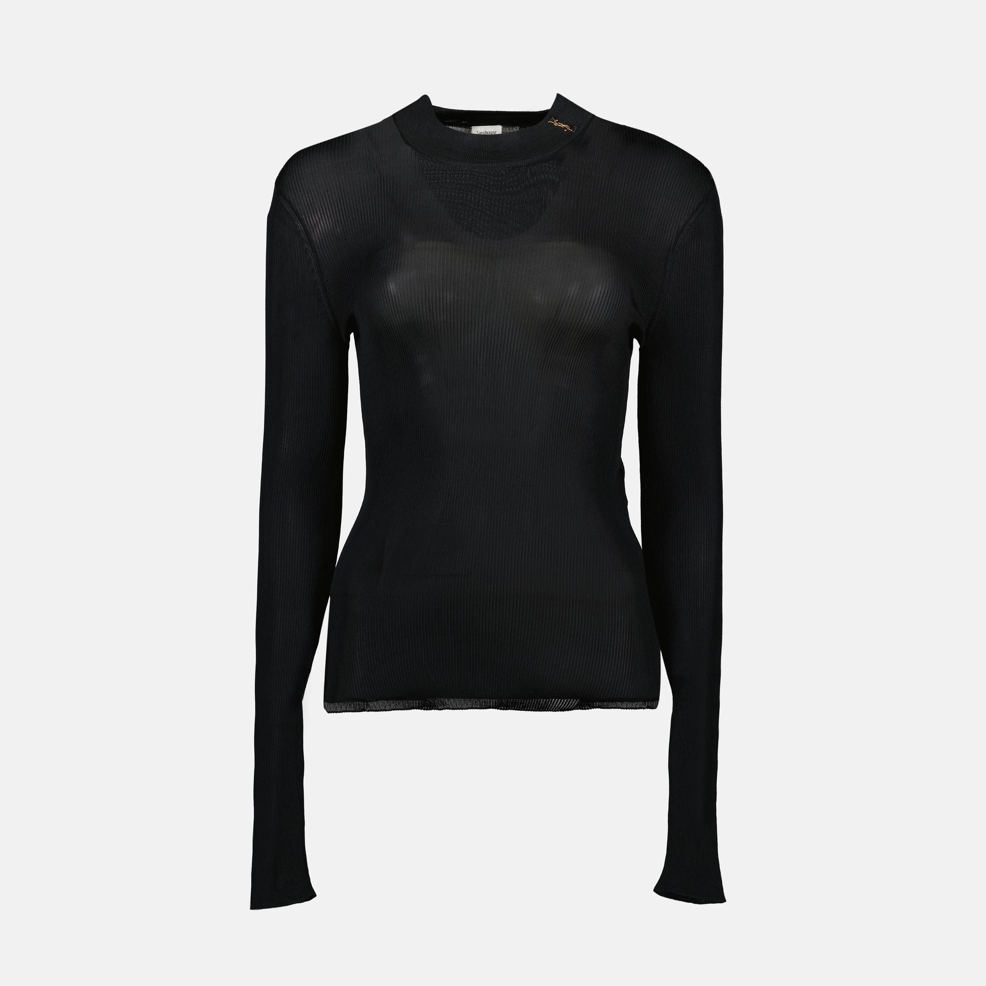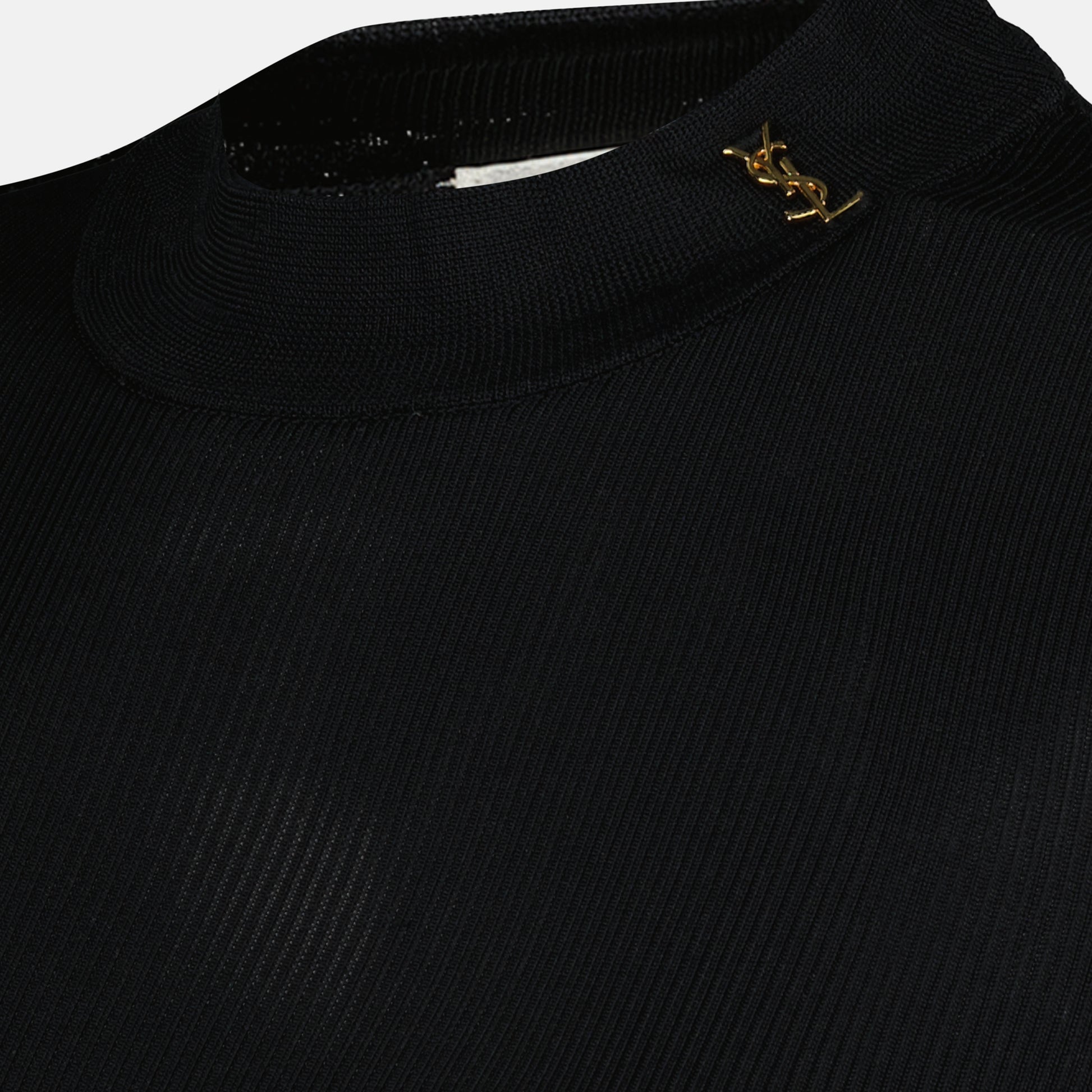 Pull en laine noir de Saint Laurent pour femme. Ce modèle fait partie de la collection Printemps-Été 2025 et présente un col rond, des manches longues et une coupe slim.
