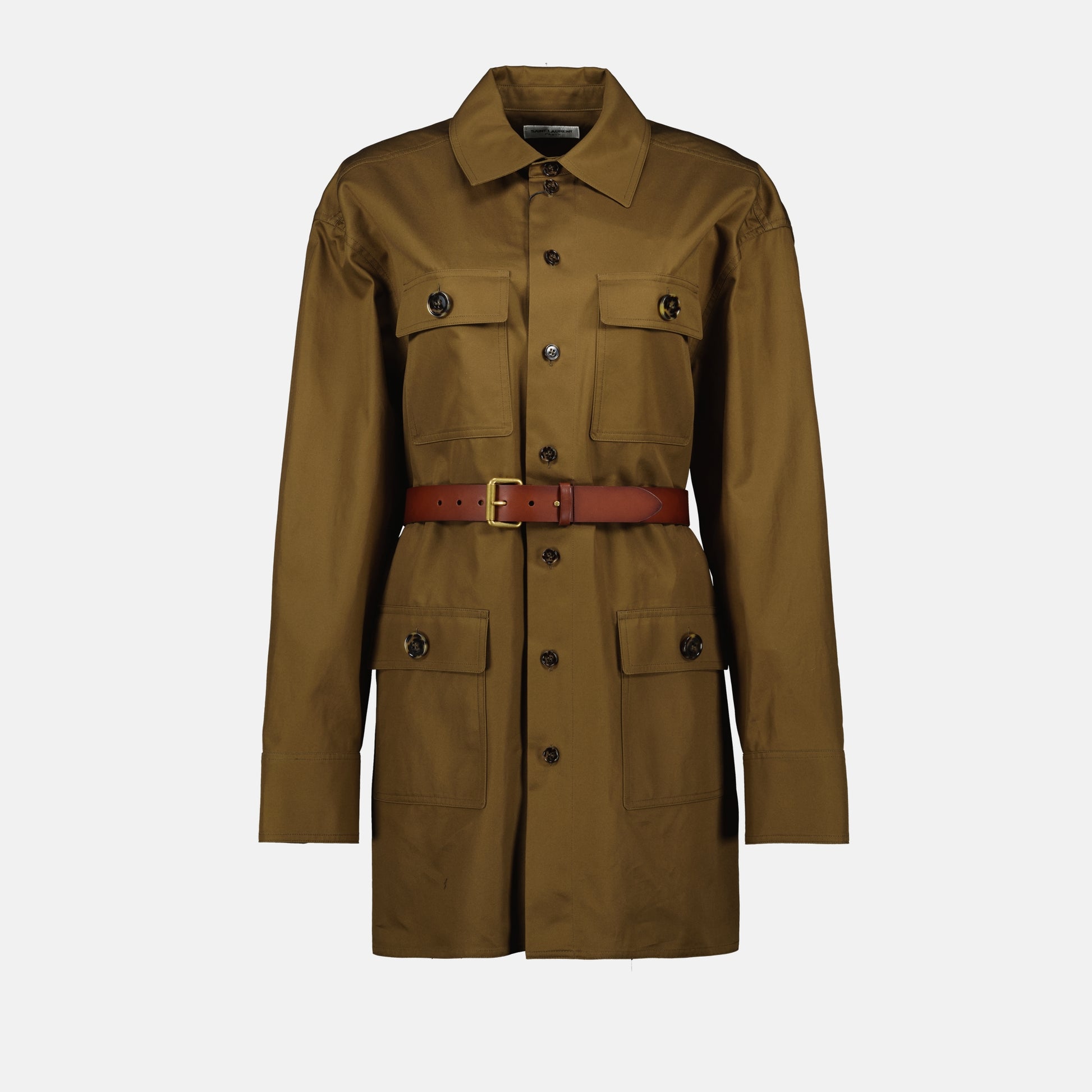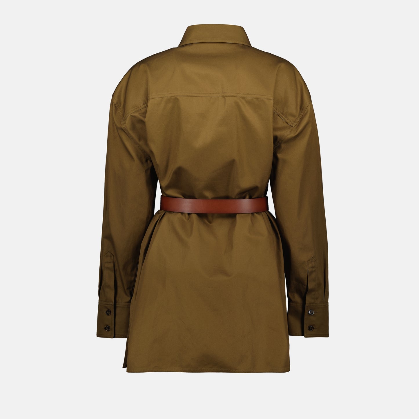 Robe chemise marron kaki de Saint Laurent pour femme, réalisée en coton et cuir. Cette pièce fait partie de la collection Automne-Hiver 2024 avec une coupe cintrée et des détails élégants.