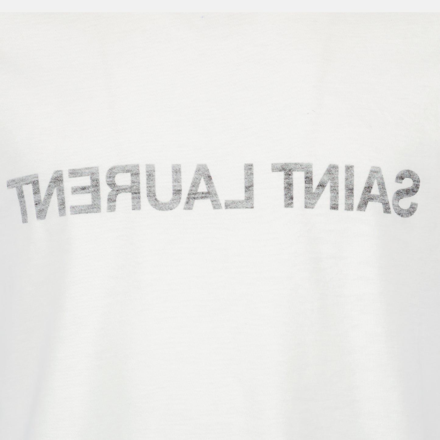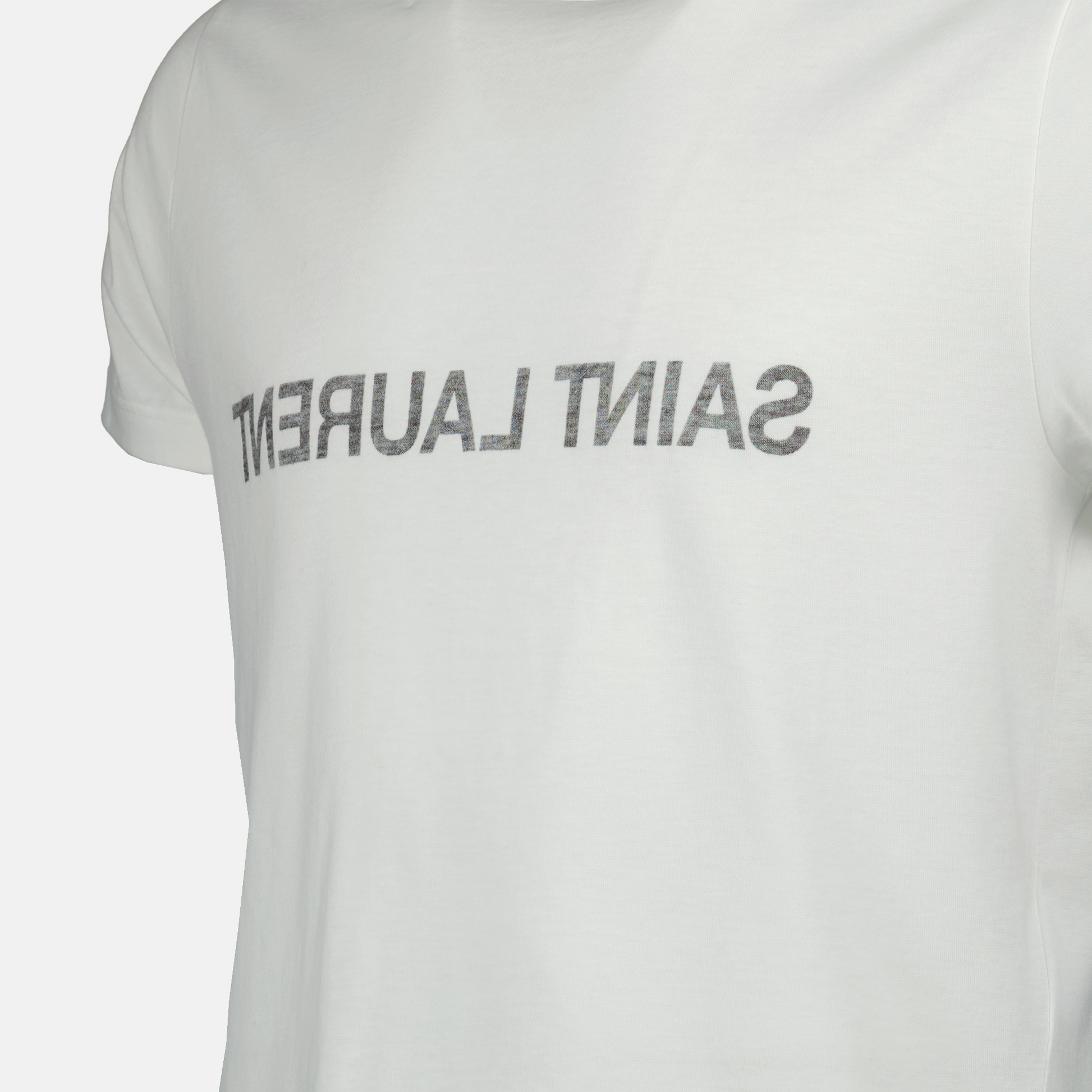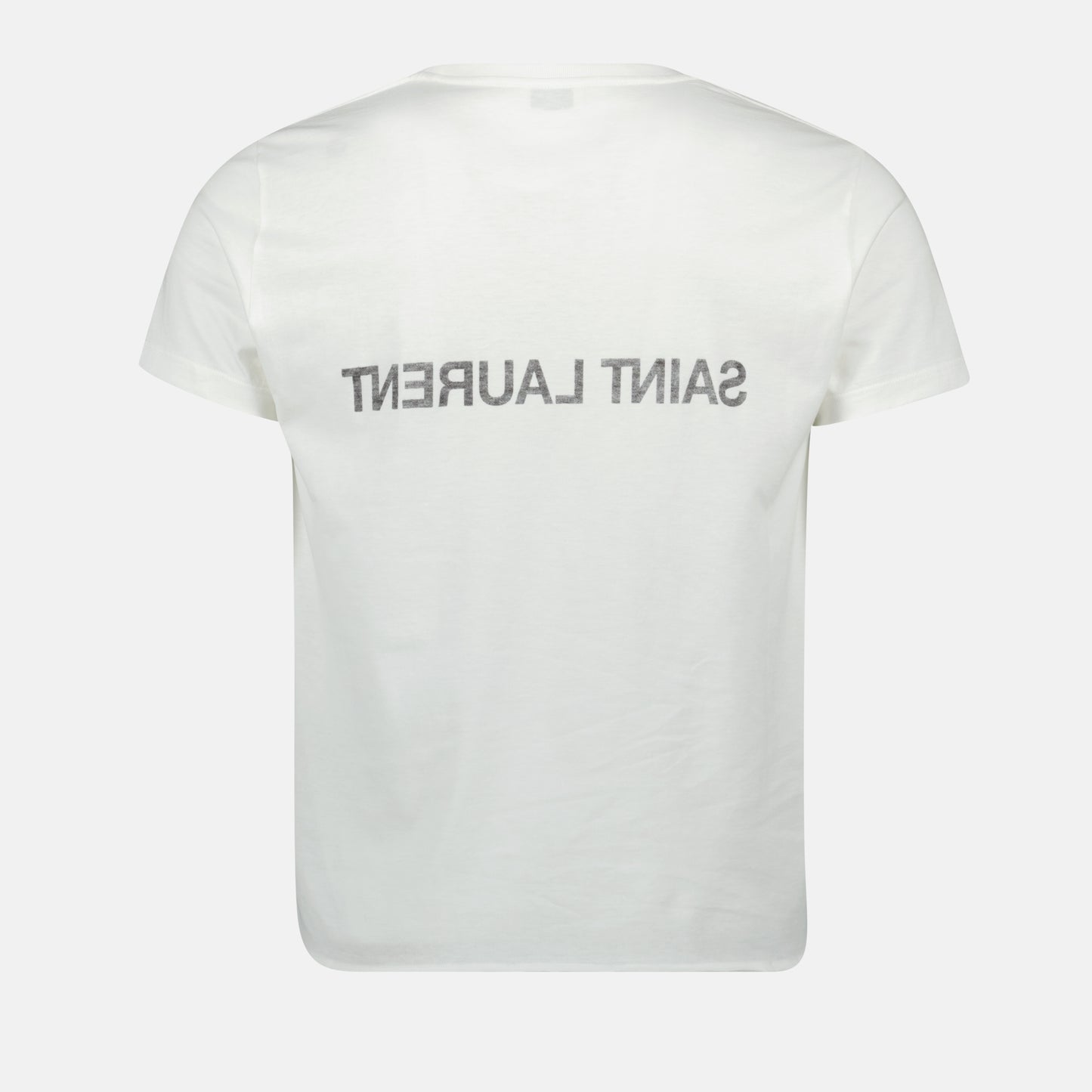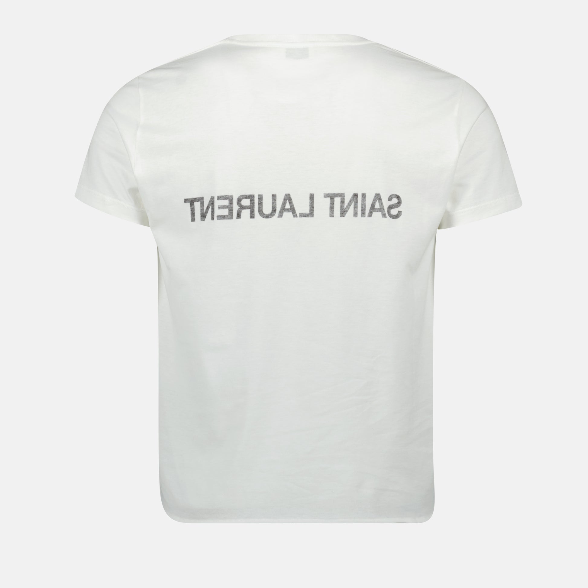 T-shirt blanc à logo reverse de Saint Laurent, conçu pour homme. Ce modèle fait partie de la collection Printemps-Été 2025 et est réalisé en coton de qualité.