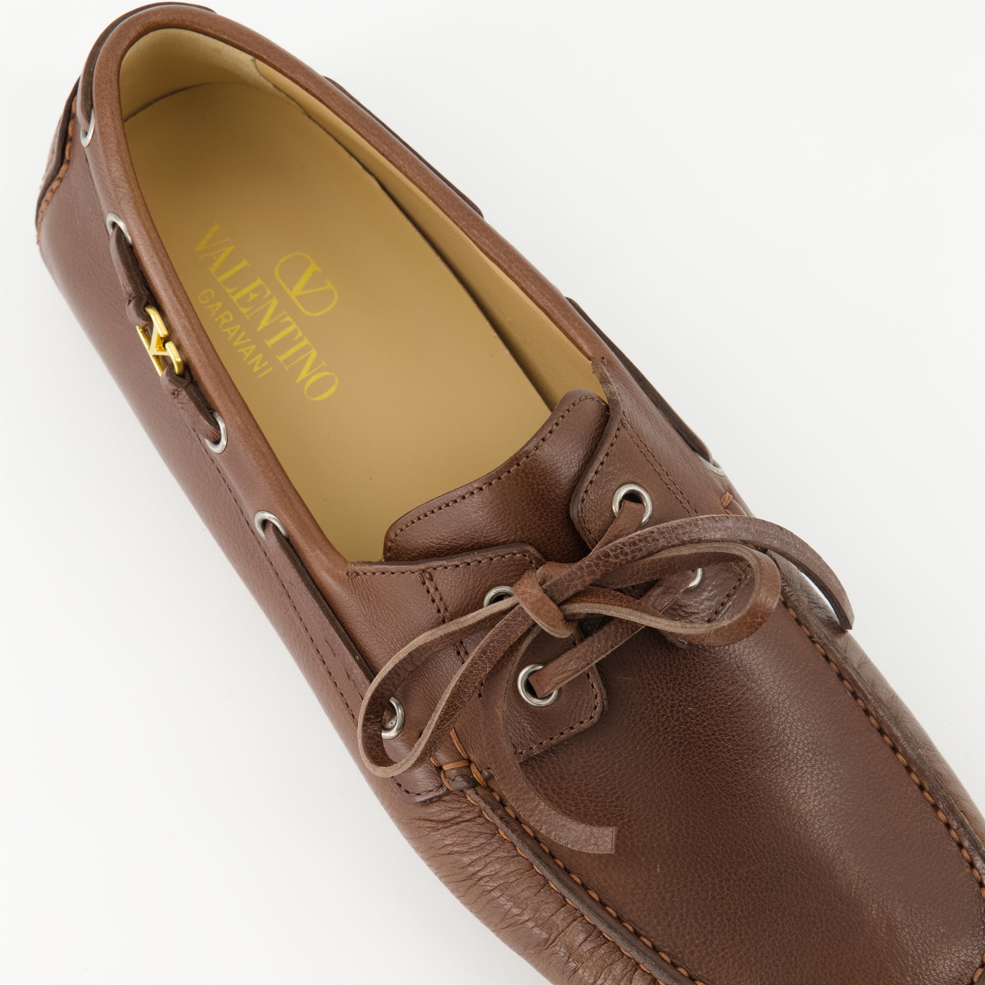 Mocassins Driver en cuir de buffle marro de Valentino Garavani pour homme, collection Printemps-Été 2025. Ils présentent un design élégant avec des détails raffinés et une semelle crantée en gomme.