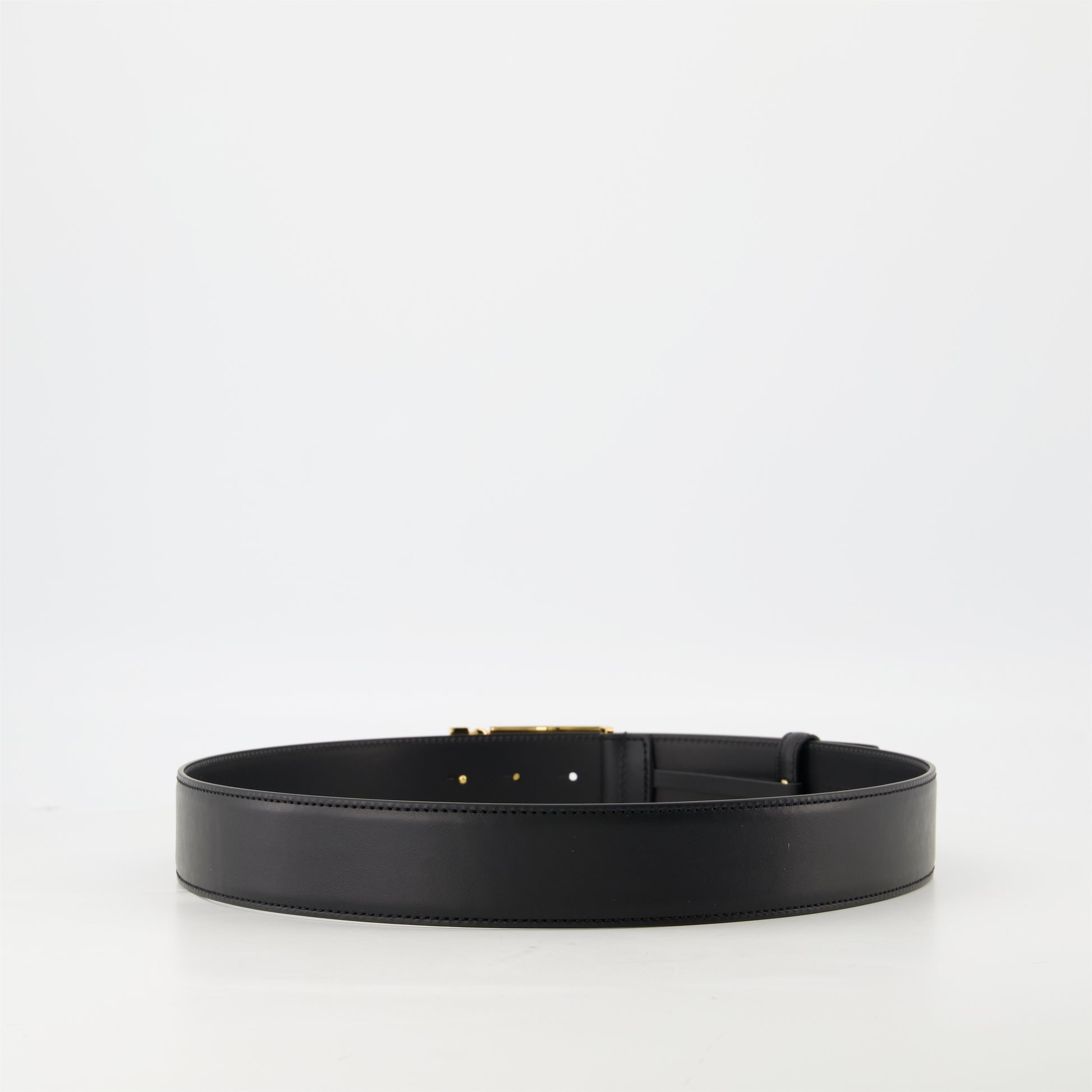 Ceinture Greca en cuir noir de Versace pour homme. Cette pièce fait partie de la collection Printemps-Été 2025 et présente une boucle Greca en métal doré.