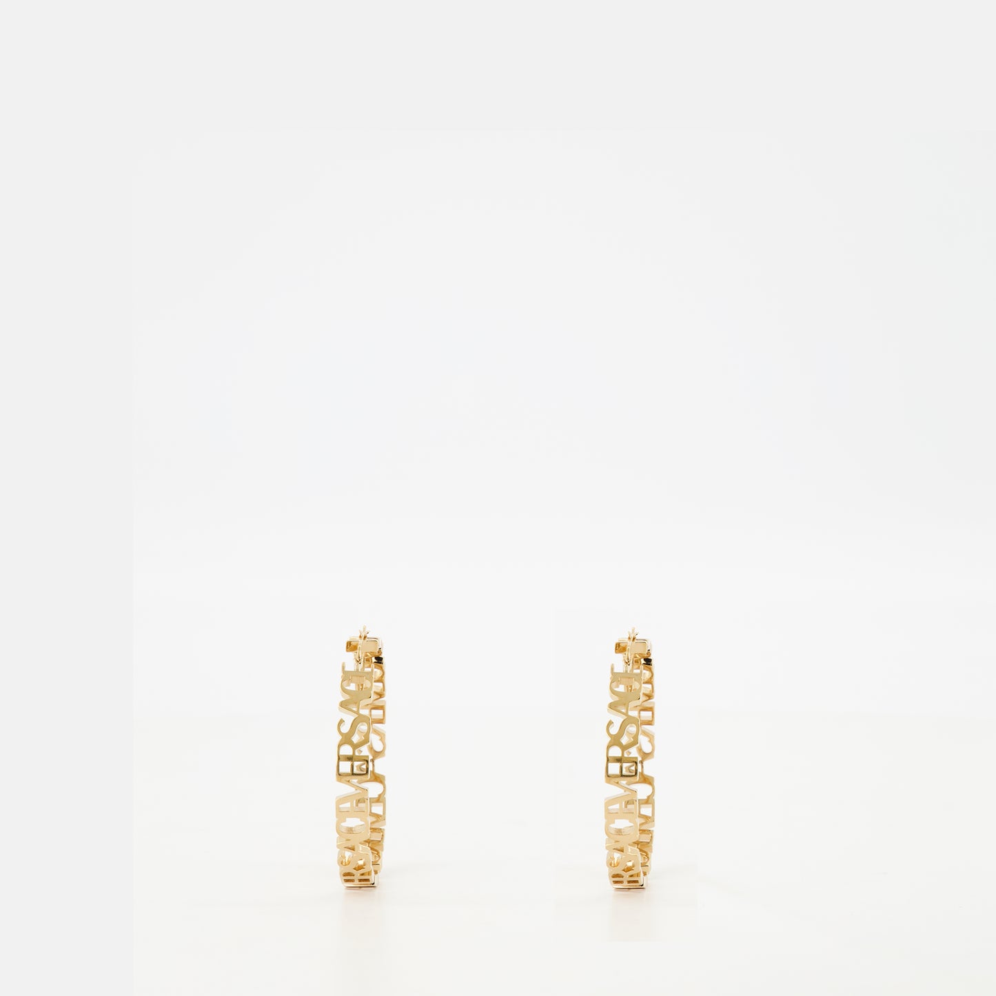 Créoles à logo doré de la marque Versace, conçues pour les femmes. Cette pièce fait partie de la collection Printemps-Été 2025, alliant élégance et modernité.