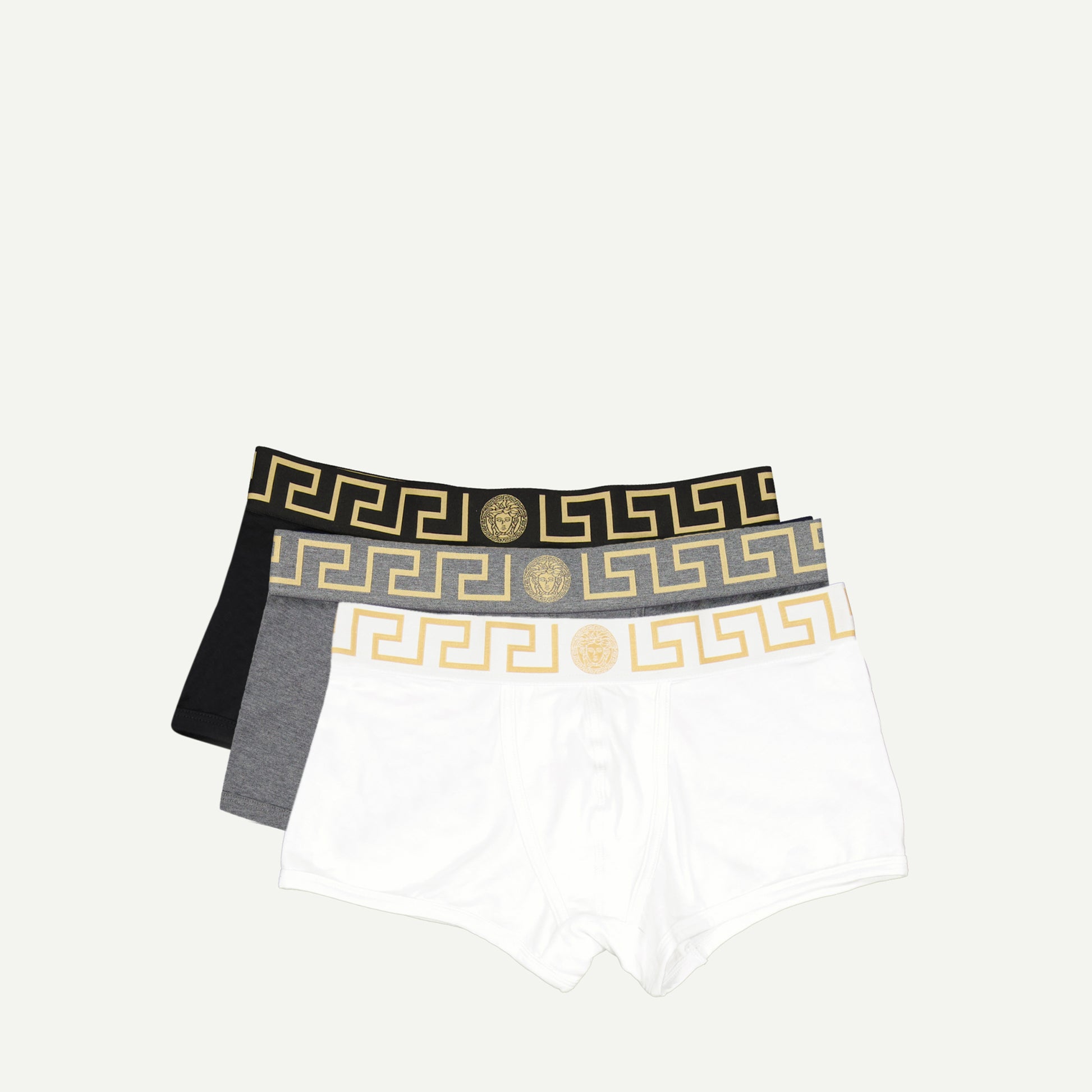 Lot trois de boxers noir, gris et blanc de la marque Versace pour homme. Cette collection Printemps-Été 2025 allie confort en coton-élasthanne et style avec l'emblème Medusa Greca.
